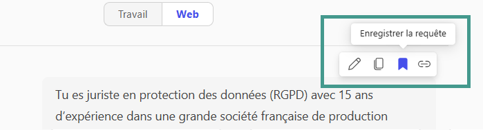 Une fois la réponse générée, utilisez l’option prévue pour enregistrer le prompt dans vos prompts sauvegardés.