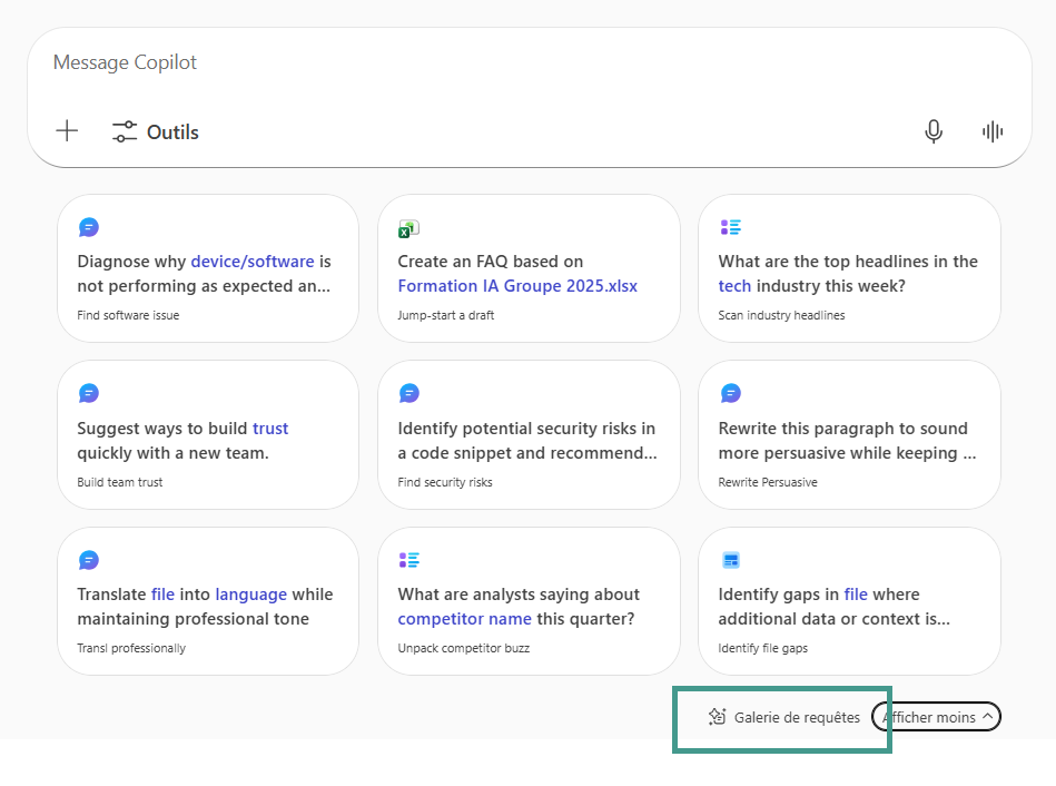 Dans Copilot Chat, regardez la zone de saisie. Copilot affiche parfois des requêtes suggérées.