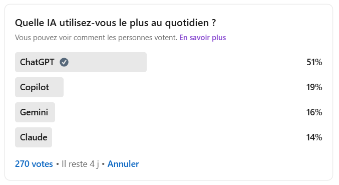 J’ai lancé il y a quelques jours un sondage sur LinkedIn pour vous demander quels outils d’IA vous utilisez le plus au quotidien.