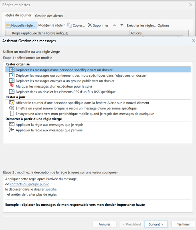 L’avocat peut par exemple définir qu’un courriel provenant d’un certain client soit immédiatement déplacé dans un dossier spécifique. Il est également possible de classer les messages selon leur objet, par exemple en regroupant tous ceux qui contiennent le terme « contrat » dans un répertoire dédié. Ces règles fonctionnent comme des filtres : elles examinent chaque message selon des critères définis, puis déclenchent une action correspondante.