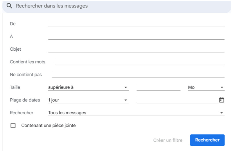 Gmail permet également de combiner plusieurs critères : expéditeur, objet, mots-clés, taille des pièces jointes.